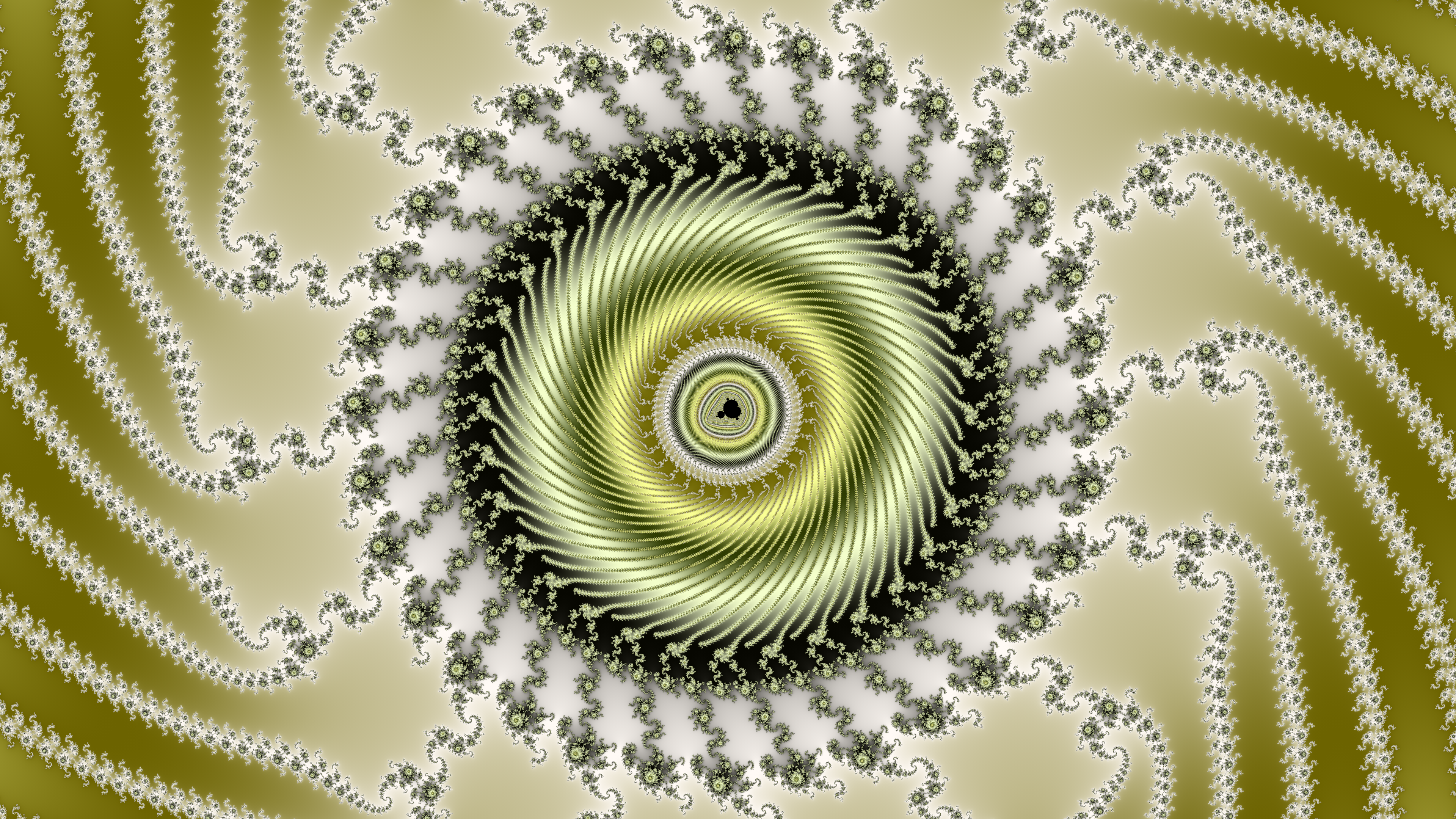 A fairly shallow zoom, only 10⁹, but in a striking place along the Mandelbrot border: the butt crack (left center in the first image above). That accounts for the swirly feathery shapes in this image.