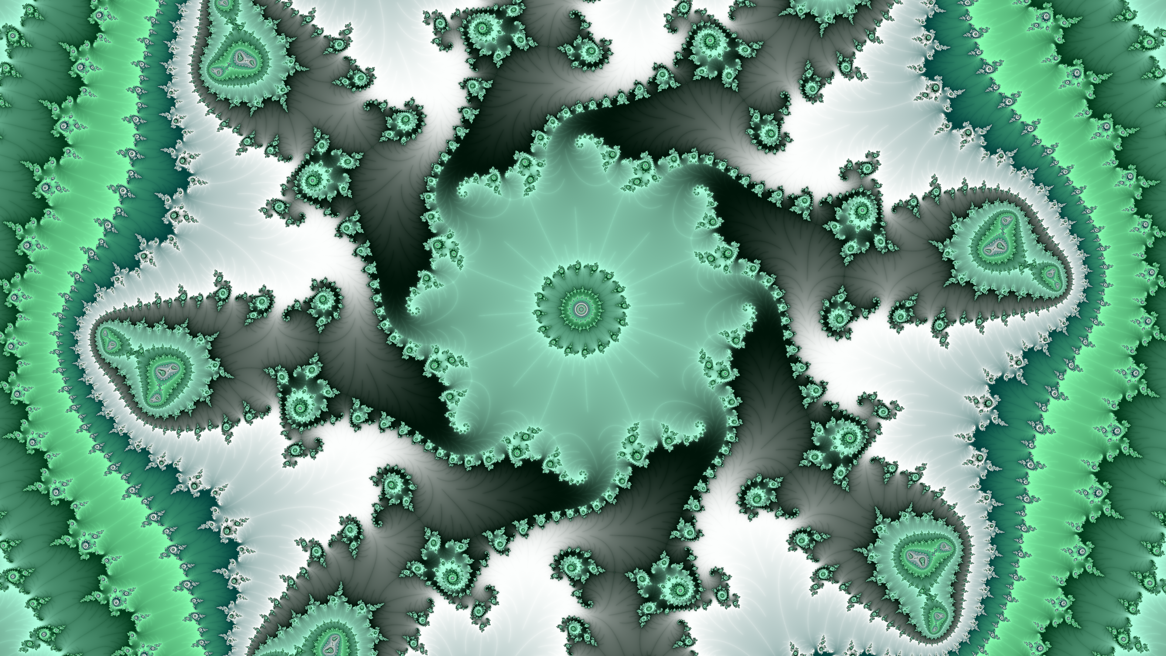 Mmmm, minty! Looks edible. I’m not usually a fan of green palettes, but sometimes they work for me. The amount of swirl depends on where along the border the zoom is. Swirls lurk in the cracks and clefts (such as in the “butt crack” but also in the clefts between the larger circular bays and the main cardioid.