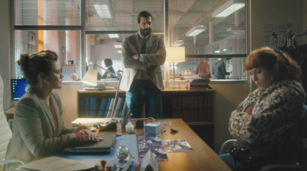 The next morning, the detectives try to figure out who wrote that. They check the security tape to discover it was their cleaning woman. They bring her in for an explanation. Which she delivers. Then, with her help, they solve the case. In the process they realize she’s a useful resource. The department captain (Marie Denarnaud) offers her a position as a consultant.