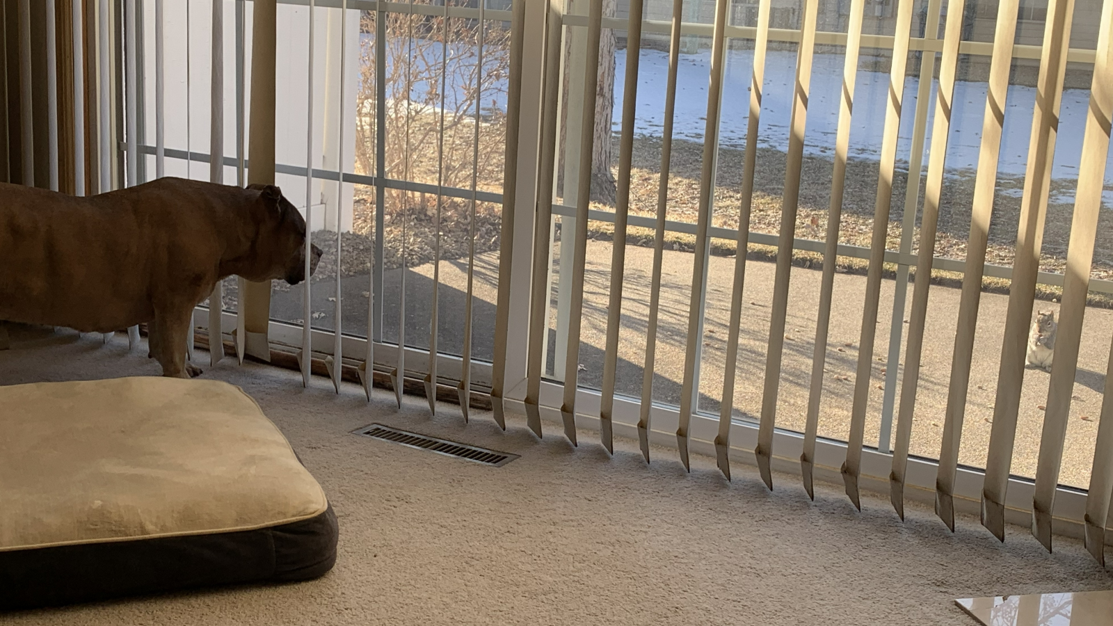 Since this winter started, every morning I’ve been throwing a handful of raw unsalted nuts outside my patio door for the local squirrels. I stopped while I had Bentley because I thought she might freak them out. I’m trying to get them used to the daily handout and maybe eventually handfeeding.