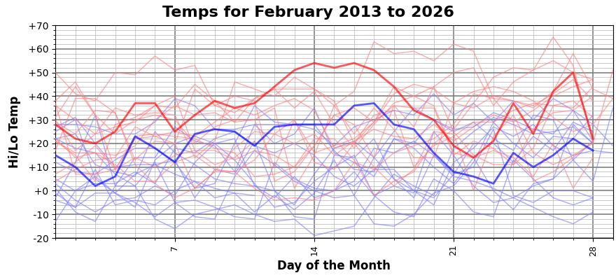 Which shows the current month (bold lines) against the faint lines of previous years going back to 2013. Certainly, our mid-month highs were record-breakers in that time span. It looks like our lows were on the warm side, too.