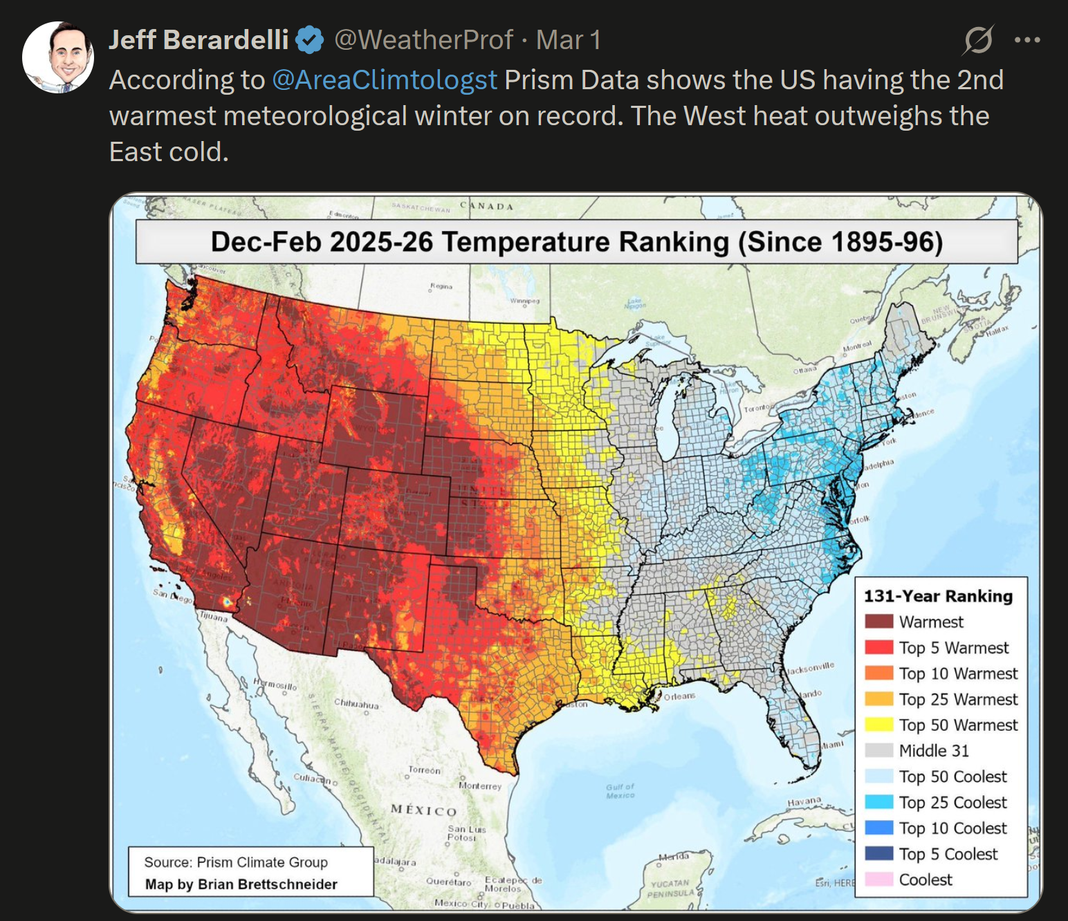 Minnesota’s winter so far is among the 50 warmest in the last 131 years, which isn’t that bad (top 40%), but a large region of the west — particularly the southwest — is having the warmest “winter” ever in over a century.