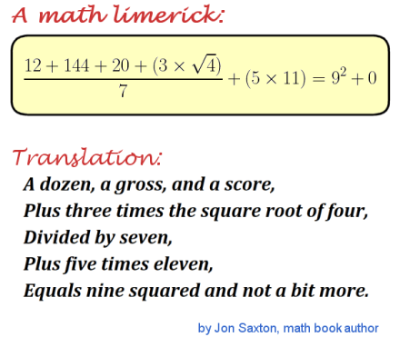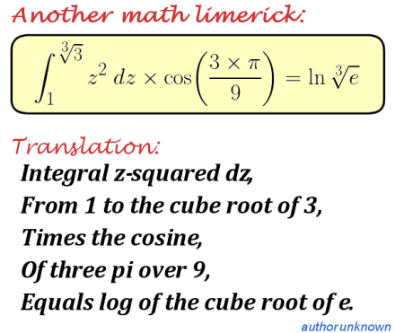 Very clever limericks, actually. That last one went through a few iterations because the original version was mathematically incorrect. (This was back when I finally figured out integrals.)