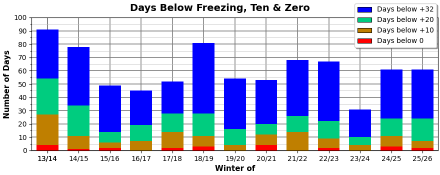 But I don’t think this chart says as much as I’d like. It would be interesting to compare these modern winters against much older ones. I’d like to try something that charts consecutive days of cold and warm temps. Winter gets painful when there is a week or more of -20 temps.