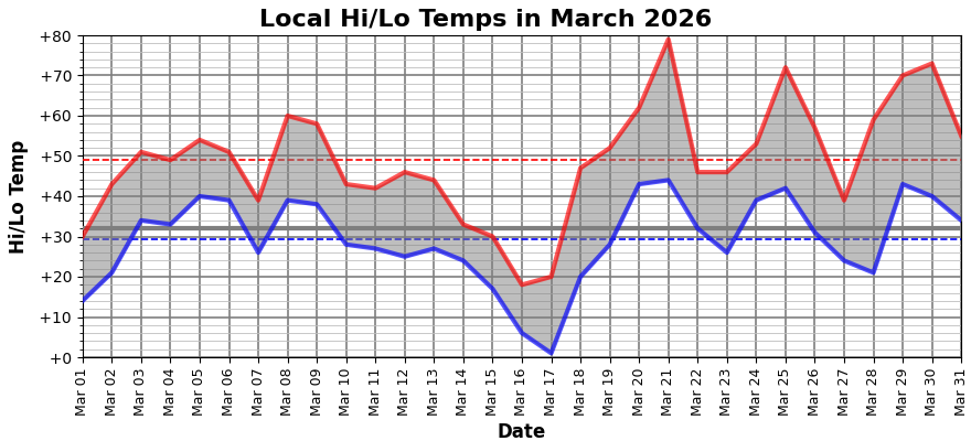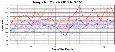 The large temperature variation we saw in January and February (see previous FN post) got even more extreme in March. Two days with highs around +20 (the 16th and 17th) and only four days later a high of +80.