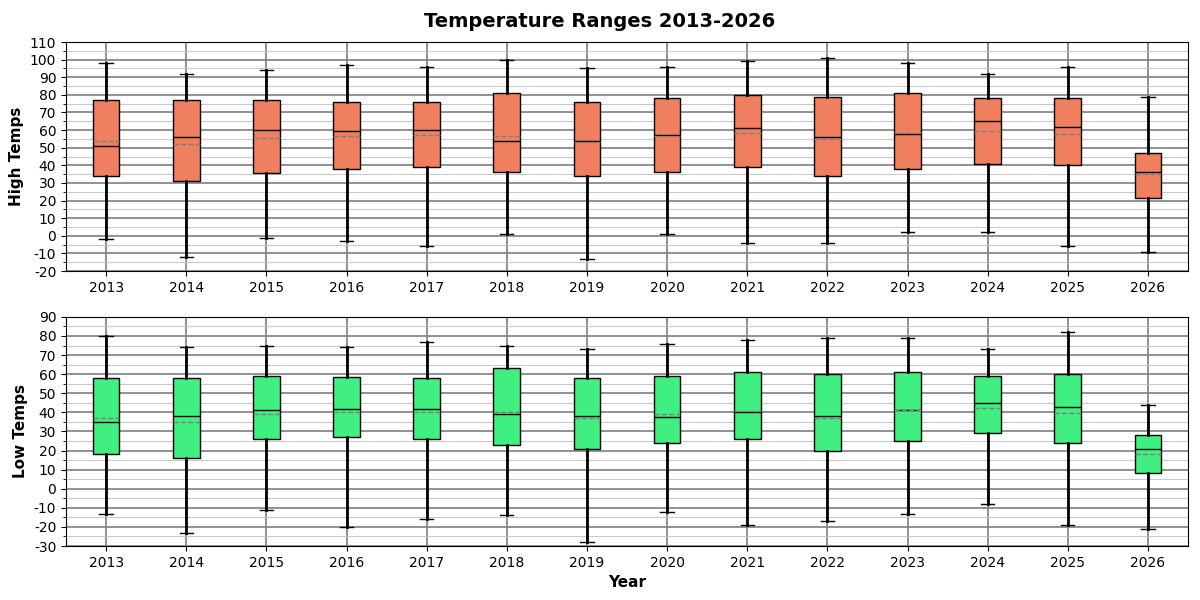 Which includes high and low temps for the whole year (which is why this year’s data is noticeably different). But I think the real problem in comparing winters is twofold. Firstly, this data set (2013-present) is just too modern; I need data going back much further (which I have but there are several pain points associated with processing it).