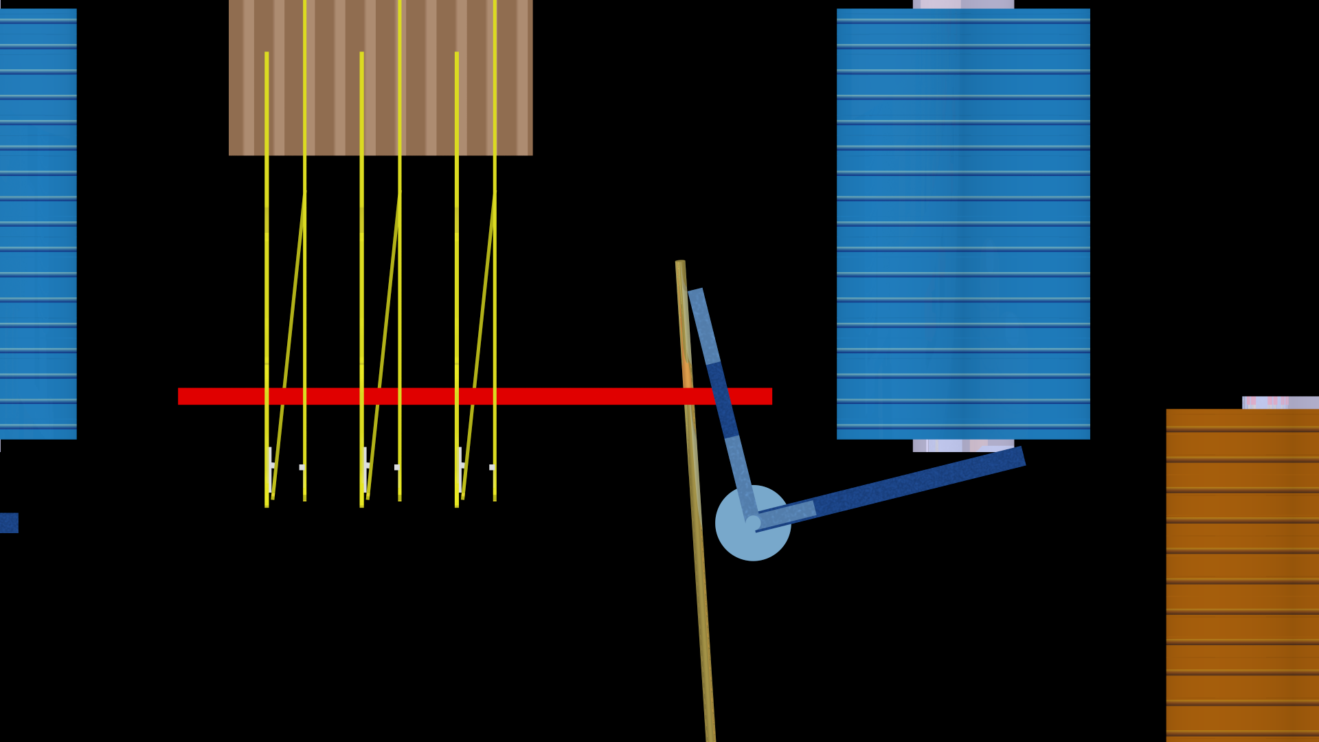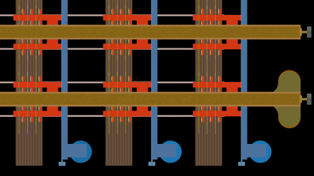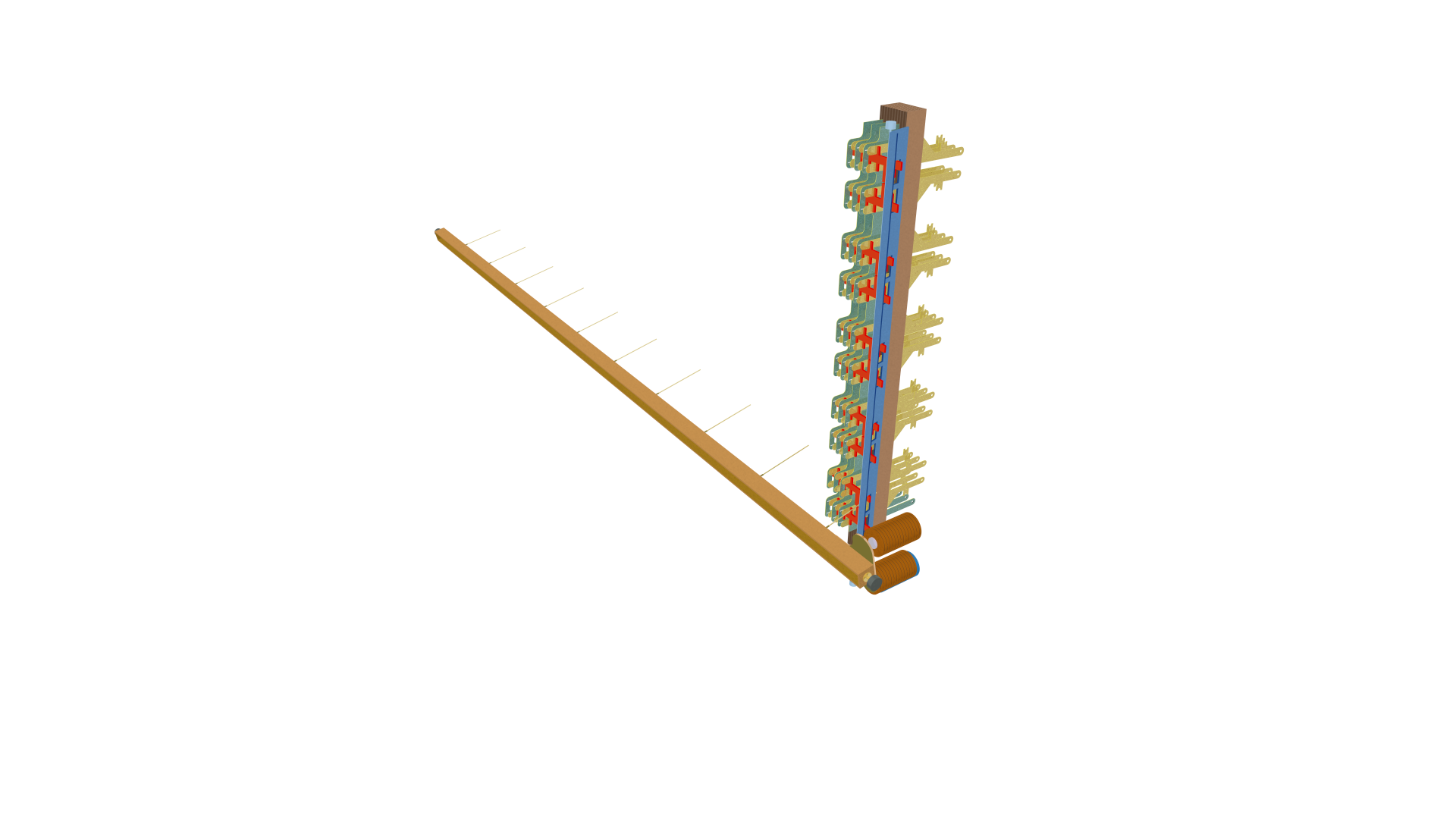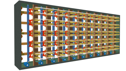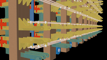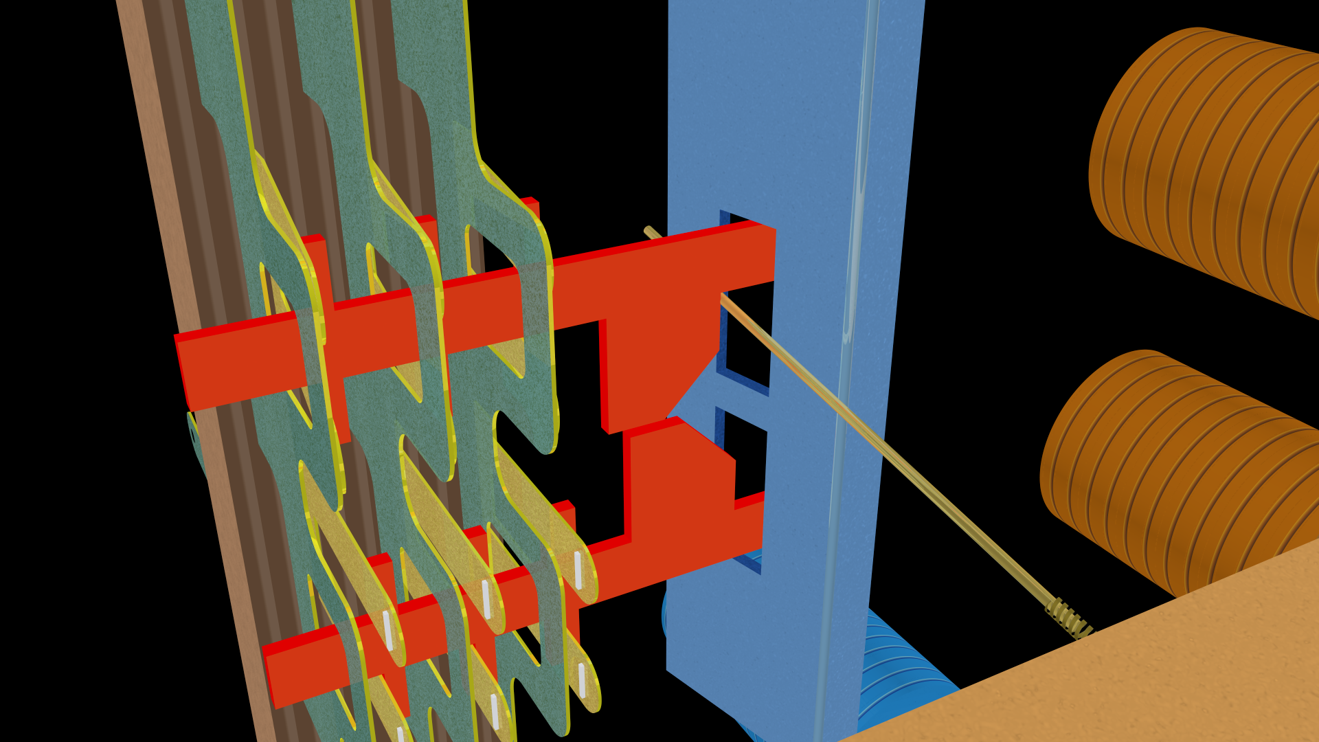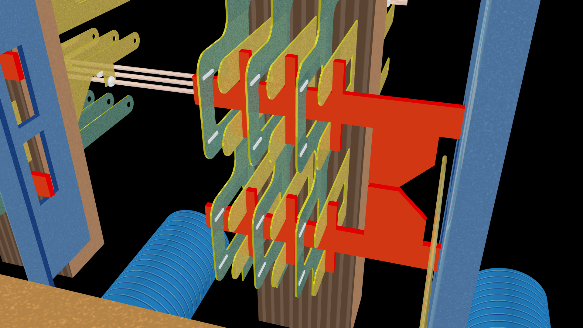 Most importantly, note the blue vertical hold bar and the slots through it, one slot per row. Also note the select fingers extending from the select bar.