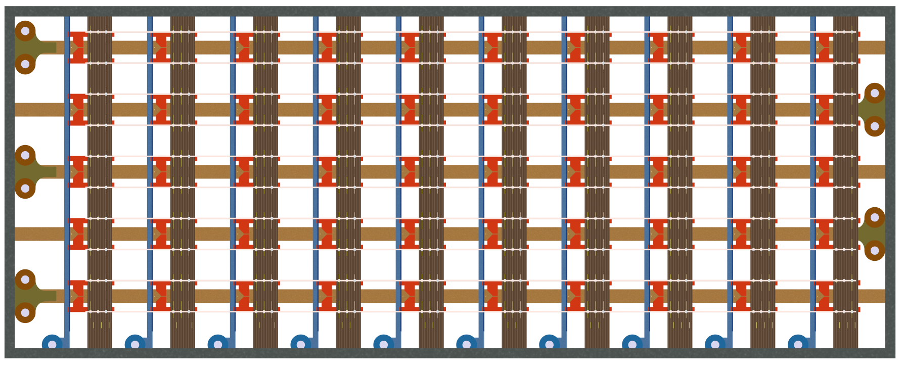 The banjo wires for the four rows run horizontally to the three conductors in each column. Along the bottom are the three hold magnets for the three vertical hold bars.