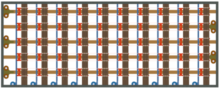 This diagram (from the first post) should make a bit more sense now. Across the top are the ten hold magnets (red). Across the left are the ten select magnets (tan). The banjo wires are the horizontal lines comprising the rows, and the vertical lines are the electrically common columns.