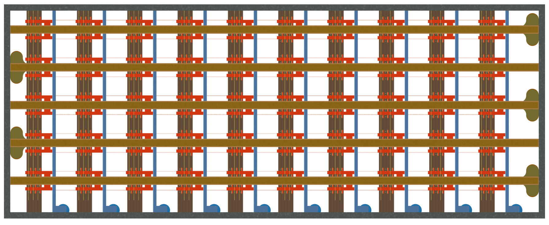 On the lower right are the connection tabs for the vertical conductors. Above them are the tabs and banjo wires for the horizontal conductors.