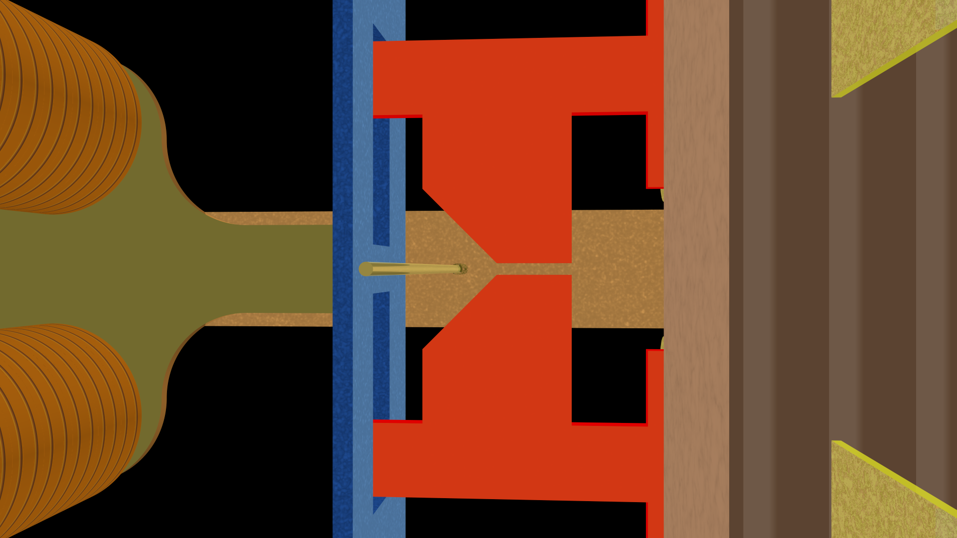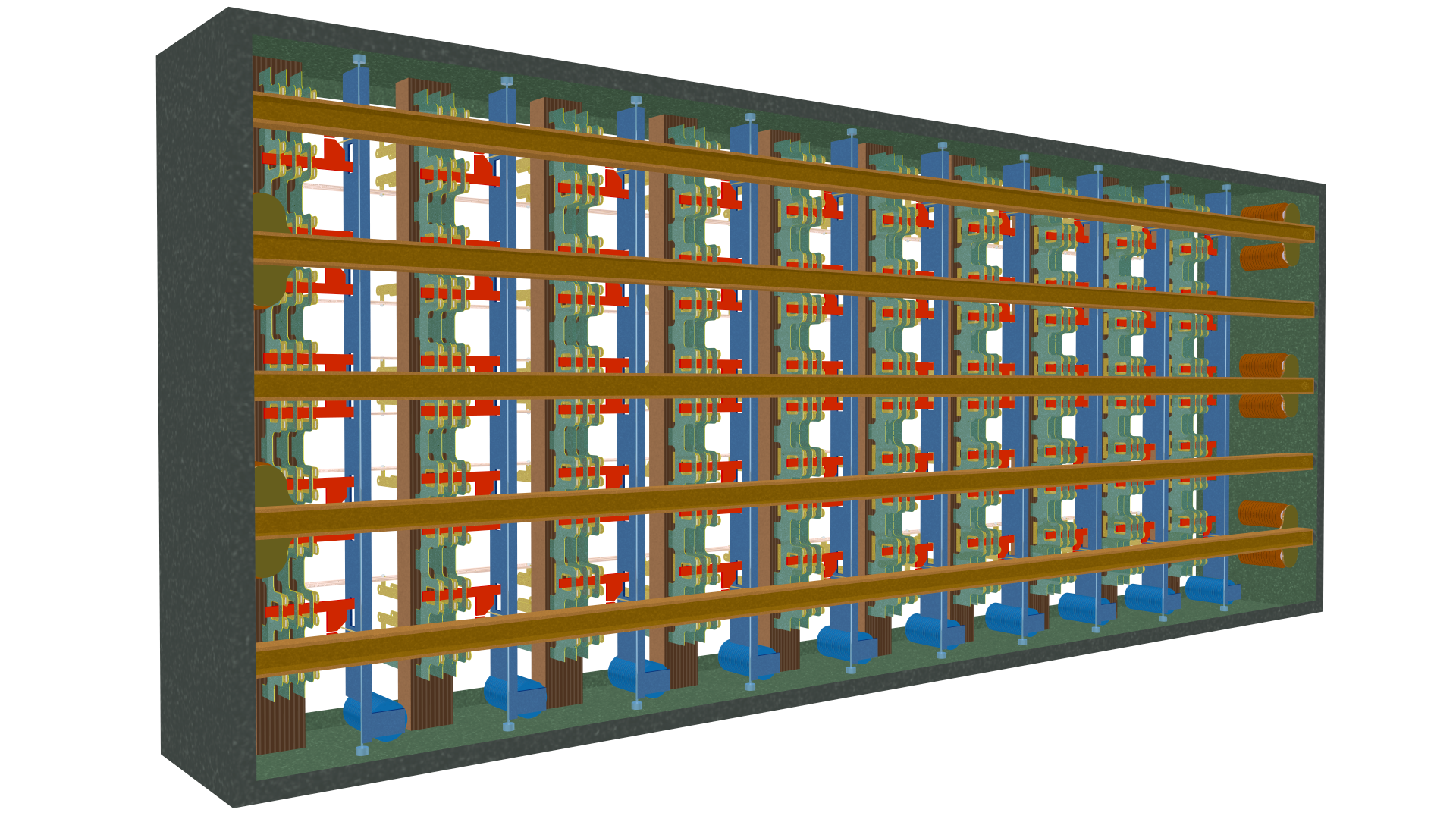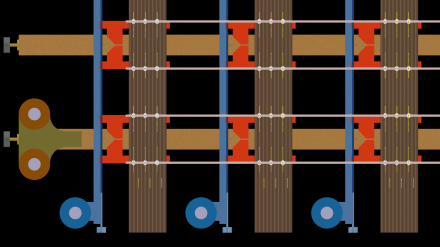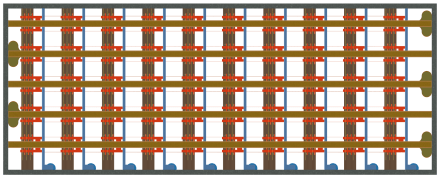Together, there are three crosspoints (in fact actually 30 because each column has ten) with the red activation cards seen edge on (red). In this image, no crosspoints are active — none of the various conductors touch.