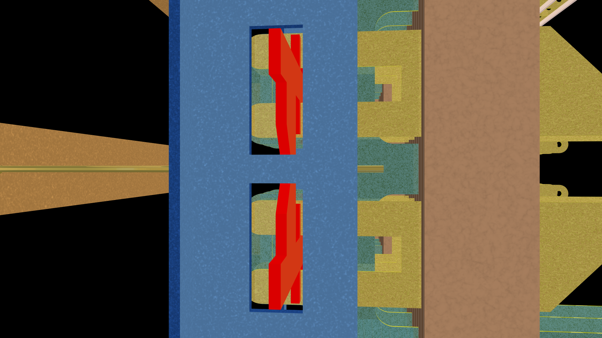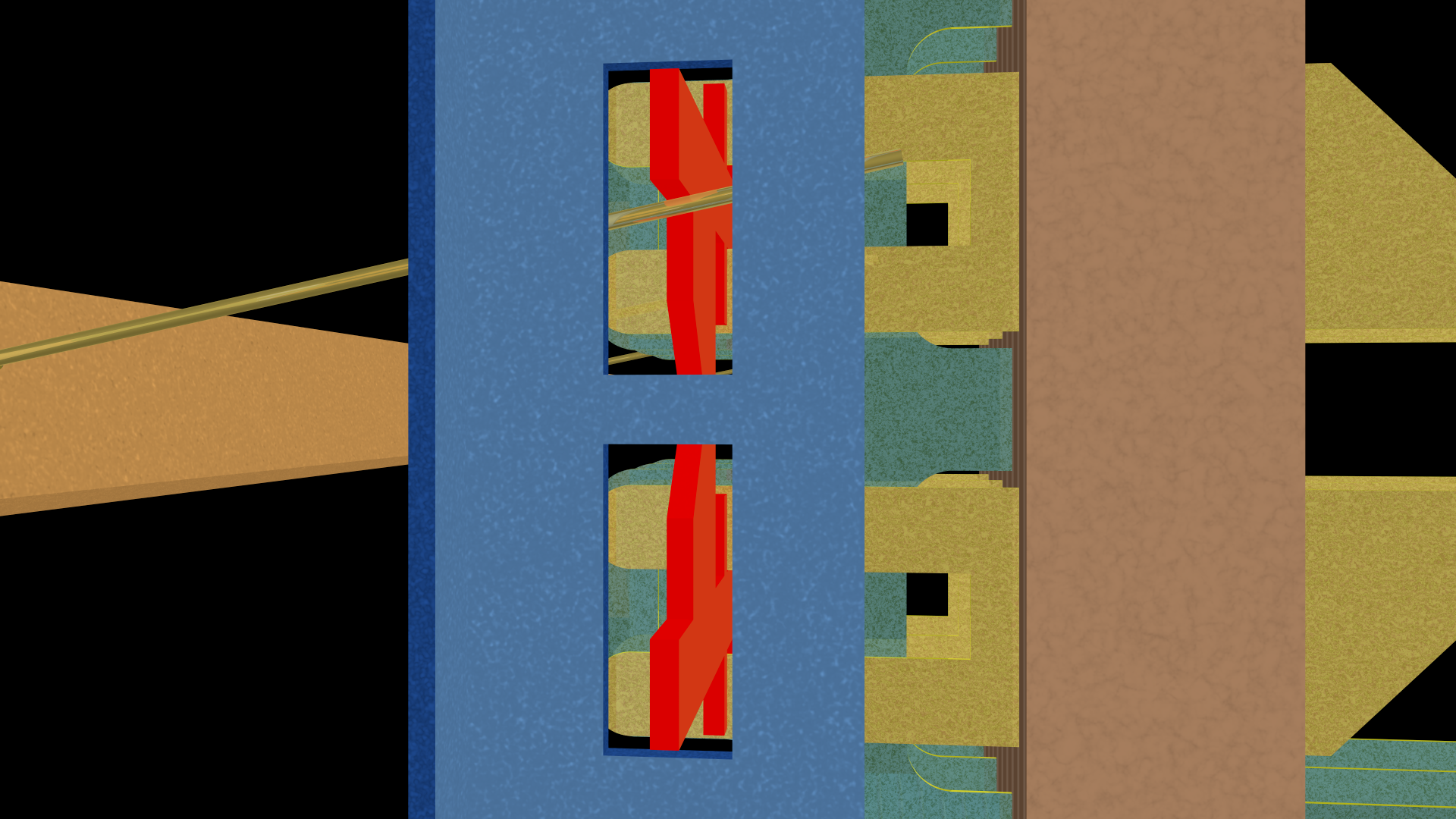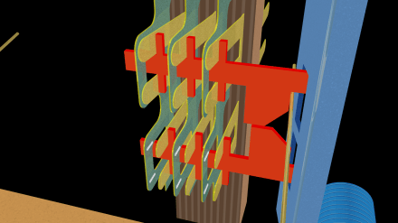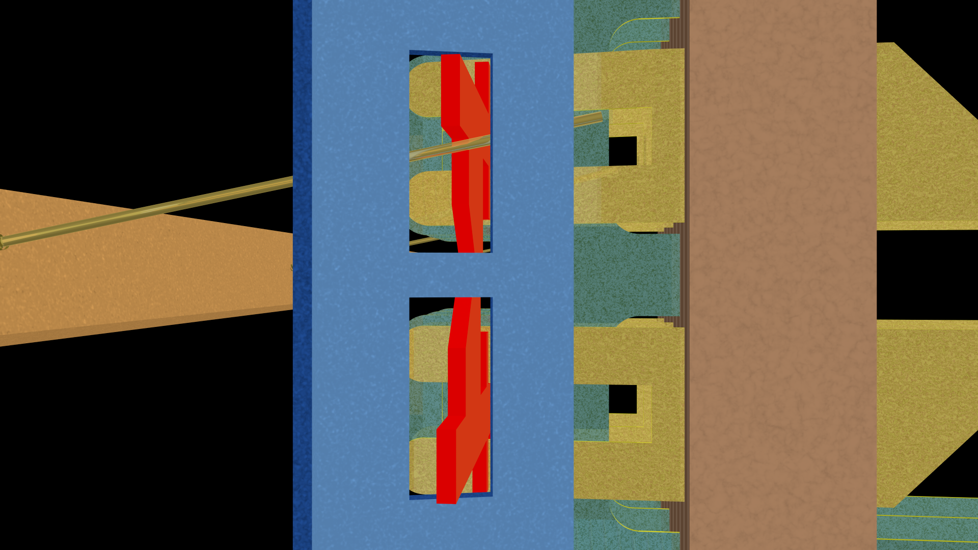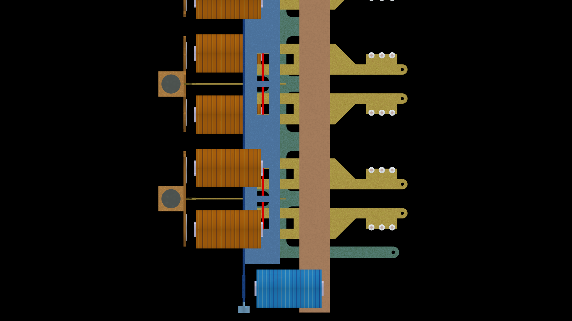 The green tabs extend through the (non-conducting) column support and extend upwards to connect all ten crosspoints in the column. The gold tabs also extend through the support to one set of contacts on this side.