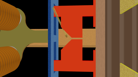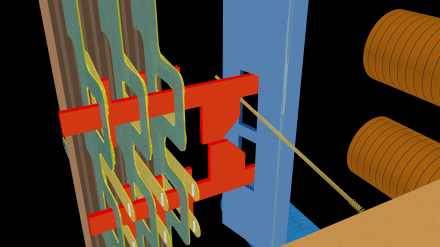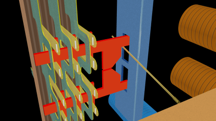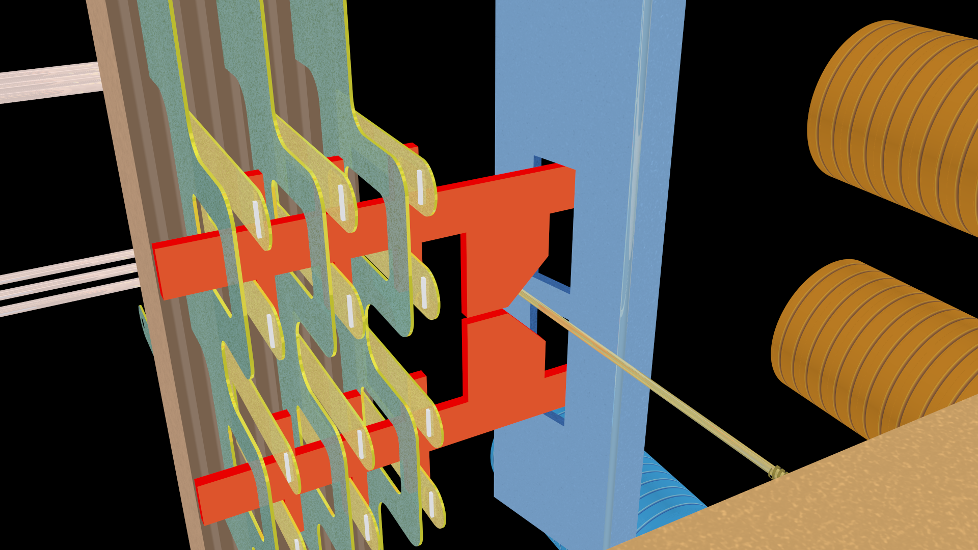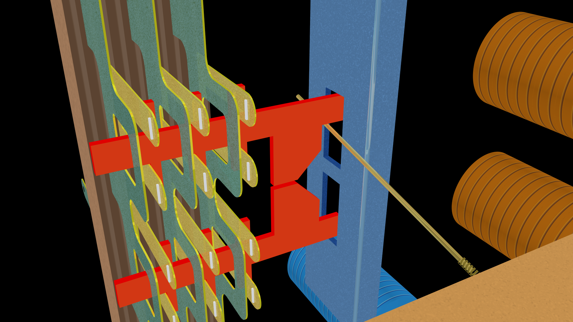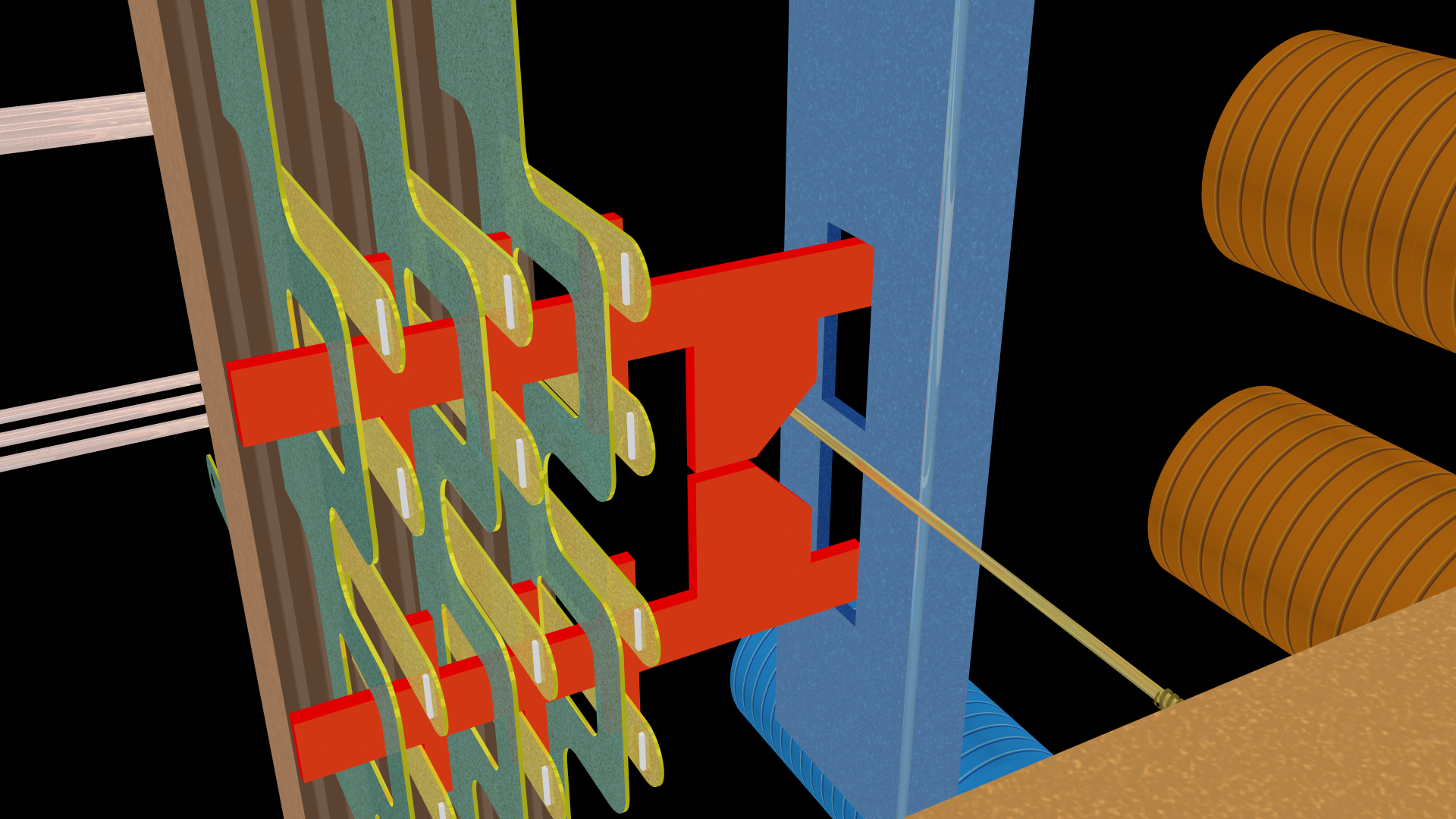 In the image above, the lower select magnet for a select bar is energized. This pulls the associated paddle towards it, thus tilting the select bar. Most importantly, the select fingers on that bar all rotate upwards.
