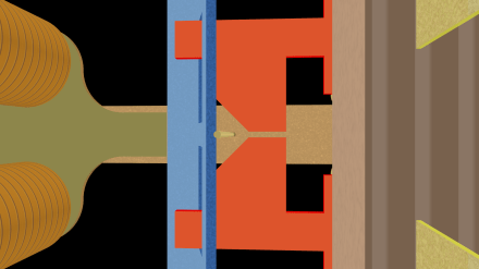 Above are a pair of crosspoints in the default position. The select finger is straight out from the select bar. None of the contacts touch. Note the tiny vertical bars of metal for each contact.