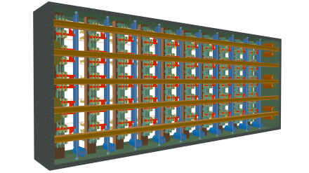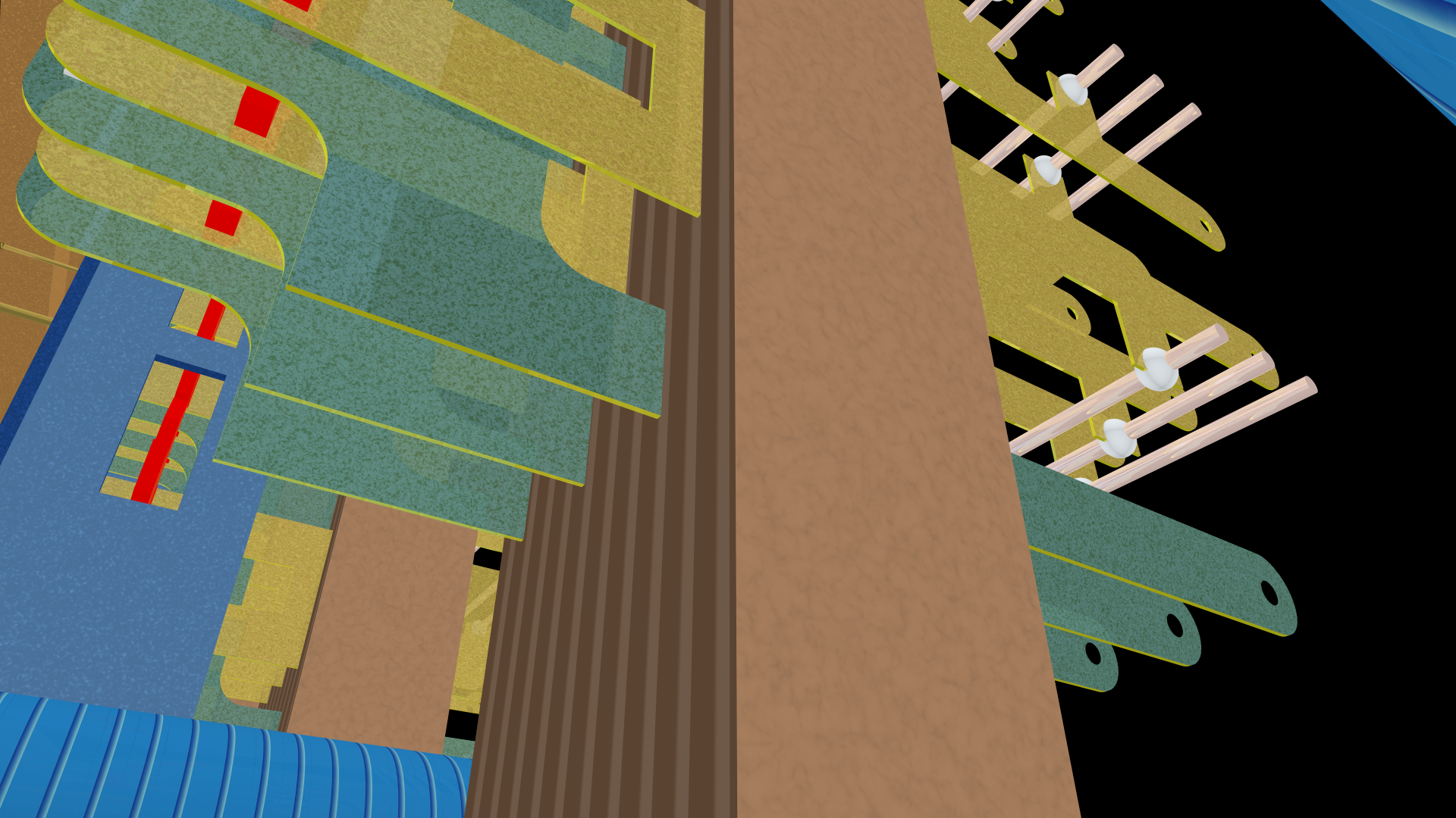 Here is another view from the side of the front showing two of the select bars running from foreground to background. Nestled among the blue vertical hold bars you can see bits of the green conductors that join the crosspoints in each column: