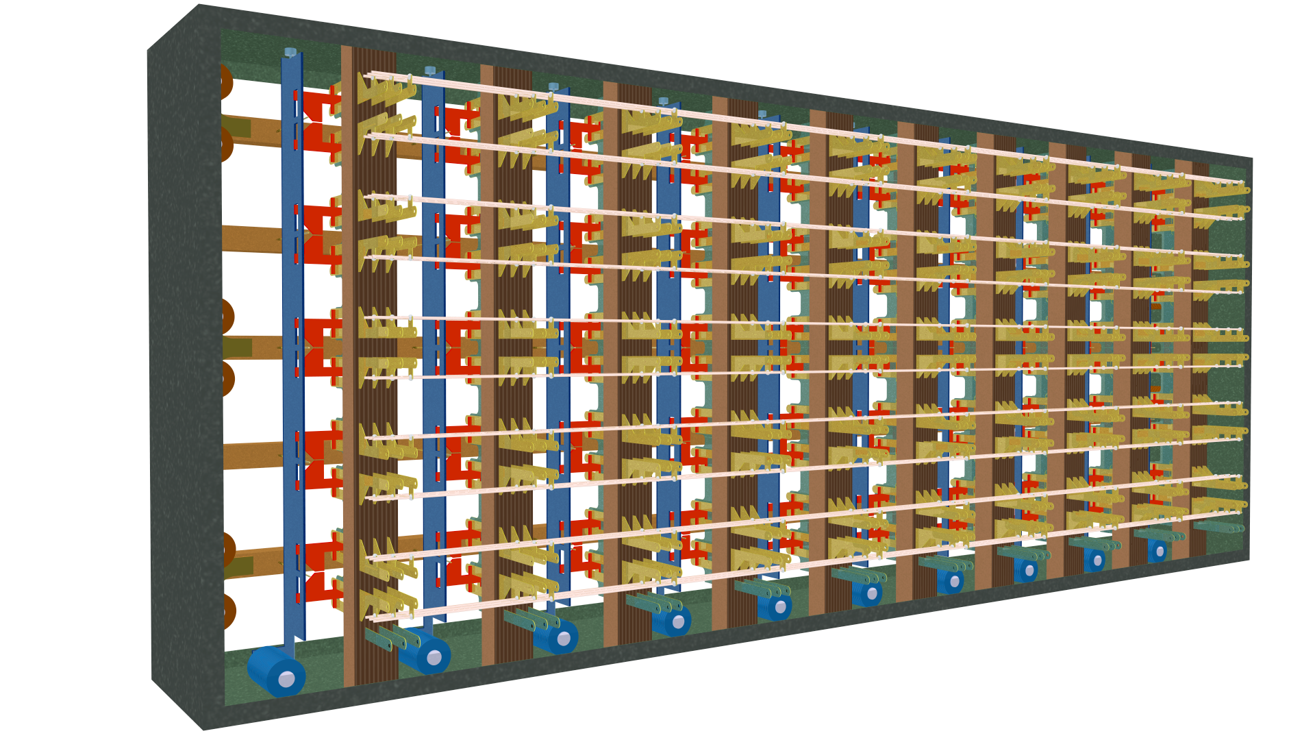 Between the horizontal select bars and the vertical column supports are a set of red plastic “activation cards”. There are twelve such cards shown, one for each set of crosspoints. They are paired in mirror versions top and bottom along each select bar.
