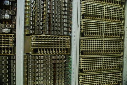The picture above shows a small part of a #5 Crossbar Switch. On the right is a rack (aka frame) of 10×20 crossbar switches. Recall from the first post that this allows a concentration of 20 input lines down to 10 output lines. These might concentrate 20 subscriber lines to 10 lines into the switch fabric — the idea being that not everyone uses the phone at the same time.