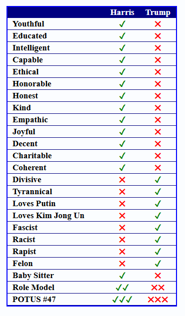 When it was Biden/Harris, the choice was obvious. Now that it’s Harris/Walz, the choice is even more obvious. I made a scorecard…