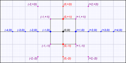 The real axis (blue) and imaginary axis (red) together form the complex number plane. The eight purple numbers are complex numbers (points) on that plane (so are the red and blues ones).