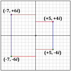 The two complex numbers on the left are complex conjugates of each other. So are the two on the right. Note how each pair is reflected across the X axis.