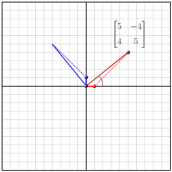 The matrix for 5+4i has two column vectors, i-hat [5, 4] and j-hat [-4, 5]. These transform the basis vectors x-hat [1, 0] and y-hat [0, 1] to [5, 4] and [-4, 5] respectively. [This is a standard linear algebra rotation/scaling. See Matrix Magic for more.]