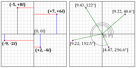 Two basic ways of representing complex numbers, rectangular (left) and angular (right). Because they are related through trigonometry, whole values in one form equate to messier values in the other.