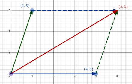 Note how the blue vector is copied to the tip of the green vector and vice versa. The sum is where the copied vectors meet (the red vector).