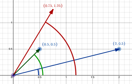 The angle of the red product vector is the sum of the blue and green vector angles. The magnitude is their product.
