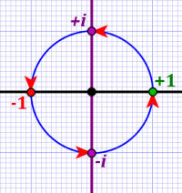 Now the rotation goes backwards (clockwise). These patterns make sense when we view multiplication by i as a 90° rotation (and by –i as a -90° rotation, although it’s actually a positive rotation by 270° — rotation is canonically measured counterclockwise from the positive X axis).